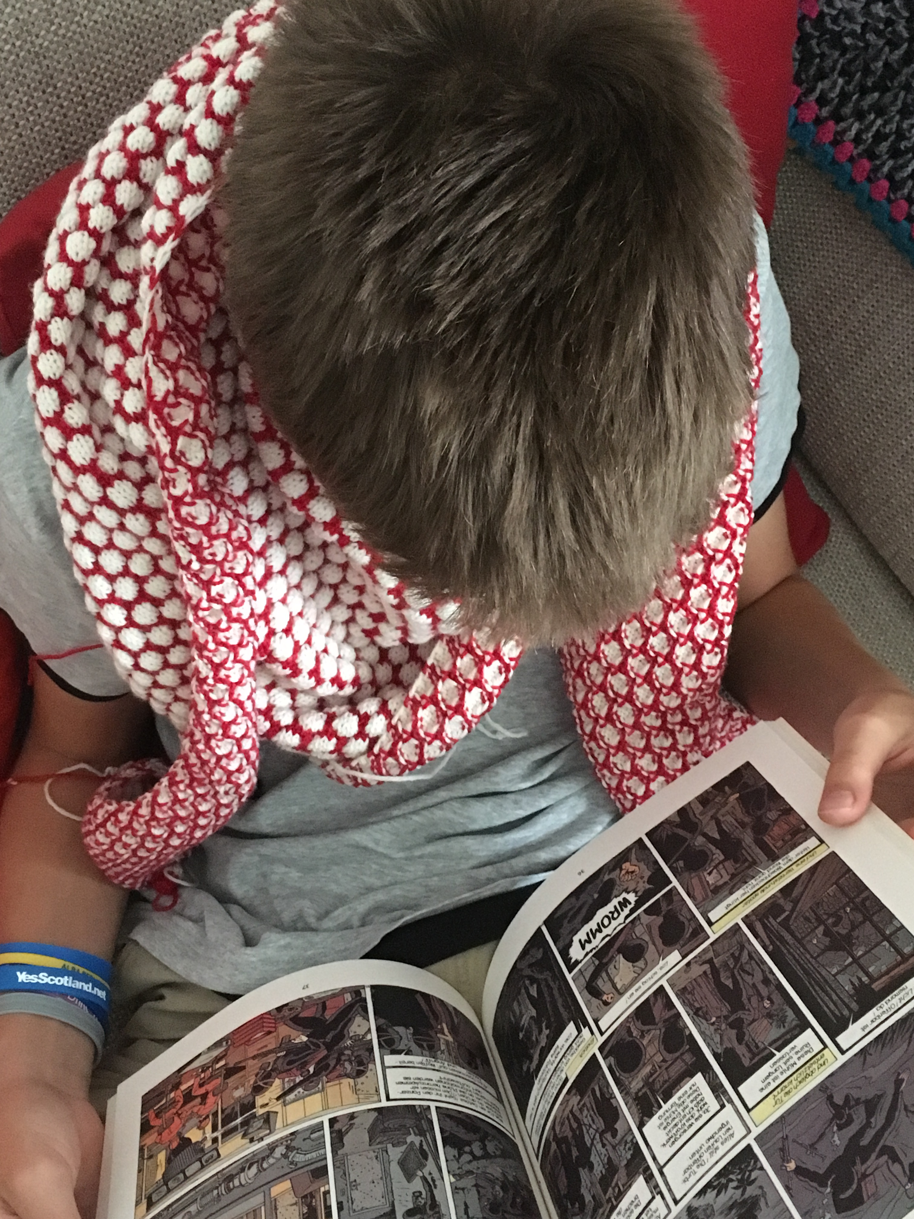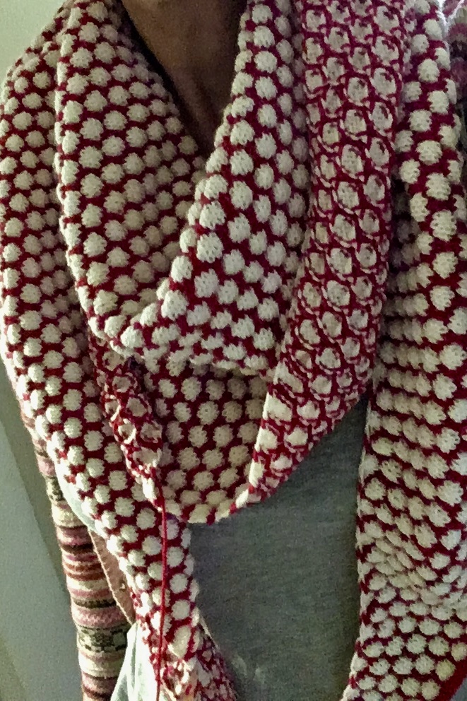 Now it is done. Pretty big (210×44 cm), very soft, with an unexpected beautiful reverse side. It is perfect – except for one minor mistake that turned out to be big. I can see it. Always. You can see it. Please look away.