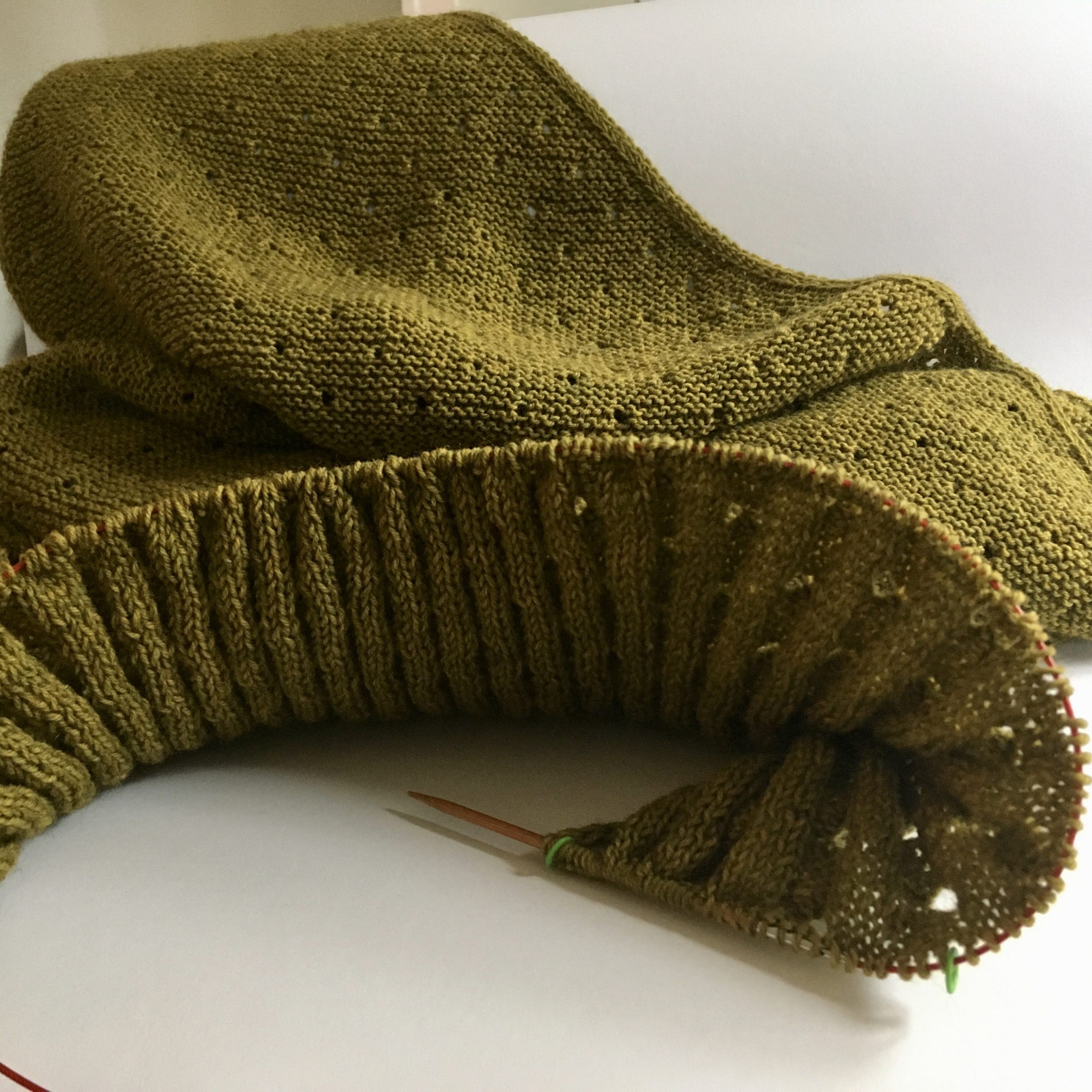 Kraus rechts, ab und an ein kleines Loch, Reihen, die immer länger wurden und trotzdem lange nicht langweilig. Es ging tatsächlich richtig flott! Anfangs …. Irgendwann habe ich dann doch den Zopf-Teil herbeigesehnt. Ich hatte genug von kraus rechts und war mir gar nicht mehr sicher, ob das, was ich da strickte, jemals groß und schön werden würde. Ich gestehe: in einer dunklen Stunde war ich (mal wieder) geneigt zu ribbeln … 🙄